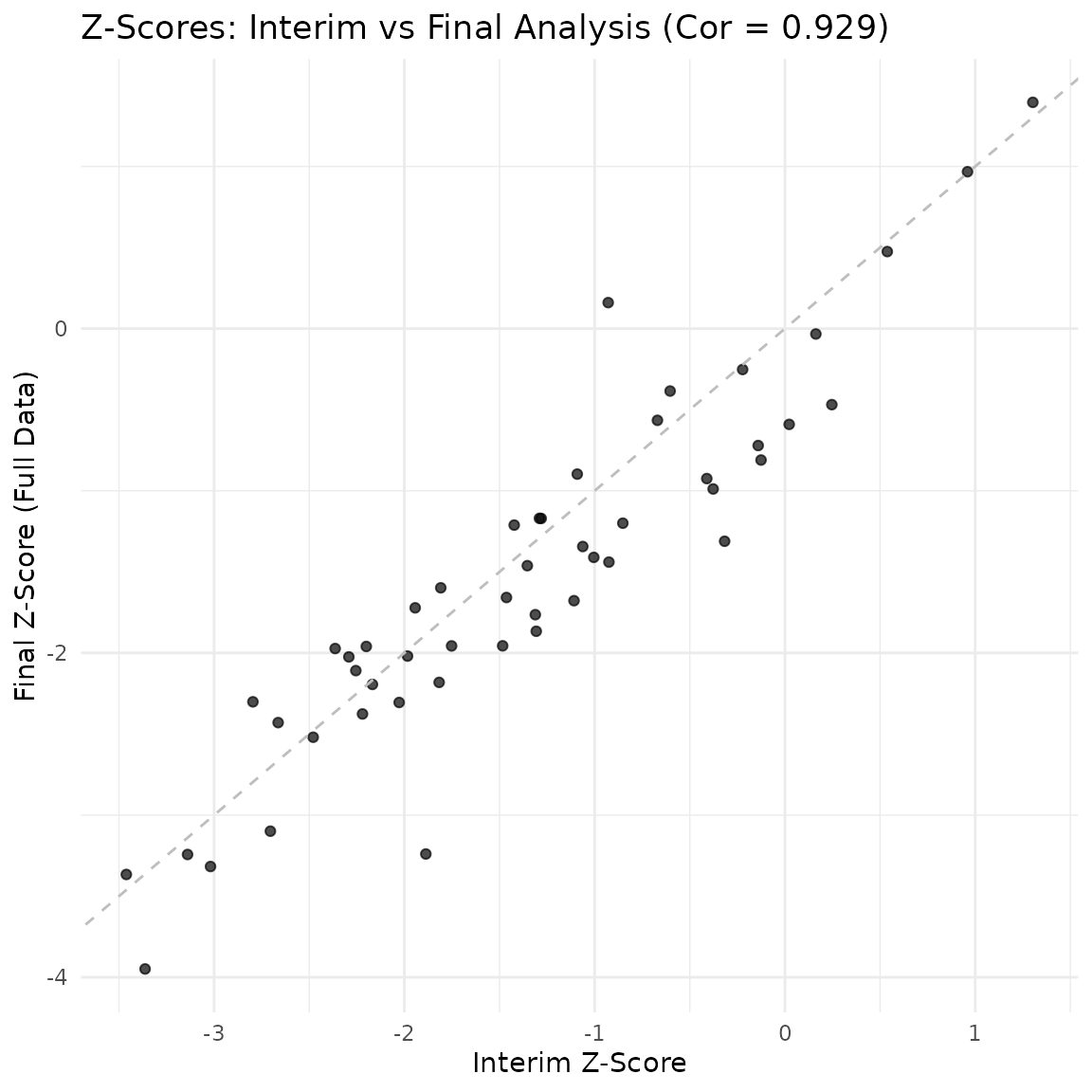 title = paste0("Z-Scores: Interim vs Final Analysis (Cor = ", round(cor_z, 3), ")"),